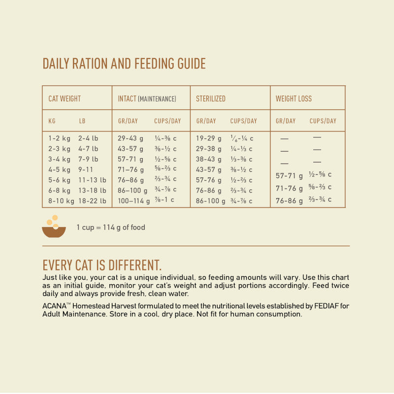 The ACANA™ Homestead Harvest Recipe satisfies your cat with plenty of protein-rich poultry. Rich with 65% quality animal ingredients including free-run chicken and turkey, Homestead Harvest is crafted with the animal protein your cat needs to be their best. This nutrient-dense recipe also helps support key health benefits for your cat, including shiny coat & healthy skin, strong muscle & bone maintenance, and healthy digestion & immune system. Nurture your feline with a poultry-rich recipe tailored to keep them healthy and happy with ACANA Homestead Harvest!