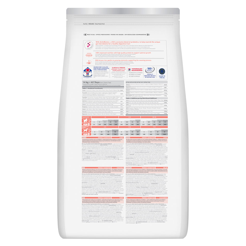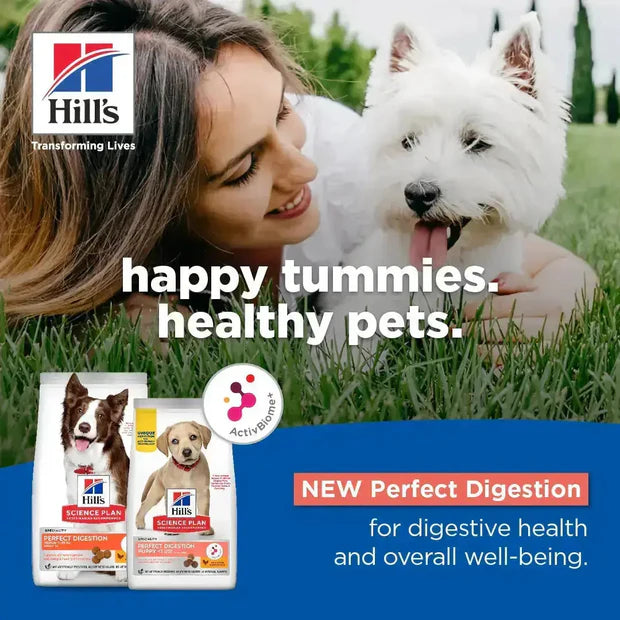 Hill's Science Plan Perfect Digestion is a large breed adult dog food with chicken and brown rice, formulated with ActivBiome+™ prebiotic blend to support healthy digestion and gut microbiome balance. Designed for dogs aged 1–5 years, it promotes regular stools, nutrient absorption, and overall digestive wellness.