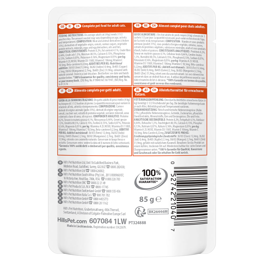 Hill's Science Plan Kitten Chicken Cat Food is a premium wet food specially formulated to support the unique nutritional needs of growing kittens from weaning through their first year of life. Each pouch features tender chunks in savoury gravy, delivering a palatable meal that kittens love while providing scientifically-balanced nutrition to fuel healthy development. This complete and balanced diet is carefully crafted to provide the precise amount of energy needed during critical growth stages, helping your kitten maintain an ideal body weight and lay strong foundations for lifelong health. The formula also supports pregnant and nursing cats, making it an excellent choice during these demanding periods when nutritional requirements are elevated.