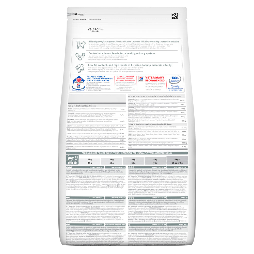 Sterilised cats are over three times more likely to become overweight and suffer with urinary problems. Hill's™ Science Plan™ Sterilised Cat Young Adult Chicken is tailored to meet the needs of sterilised cats. Formulated with clinically proven antioxidants and a unique weight management formula.Key Benefits: Unique weight management formula to burn fat and build muscles. Controlled mineral levels to support urinary health. Highly digestible ingredients for optimal nutrient absorption. Made with high quality ingredients for great taste. 100% guaranteed.