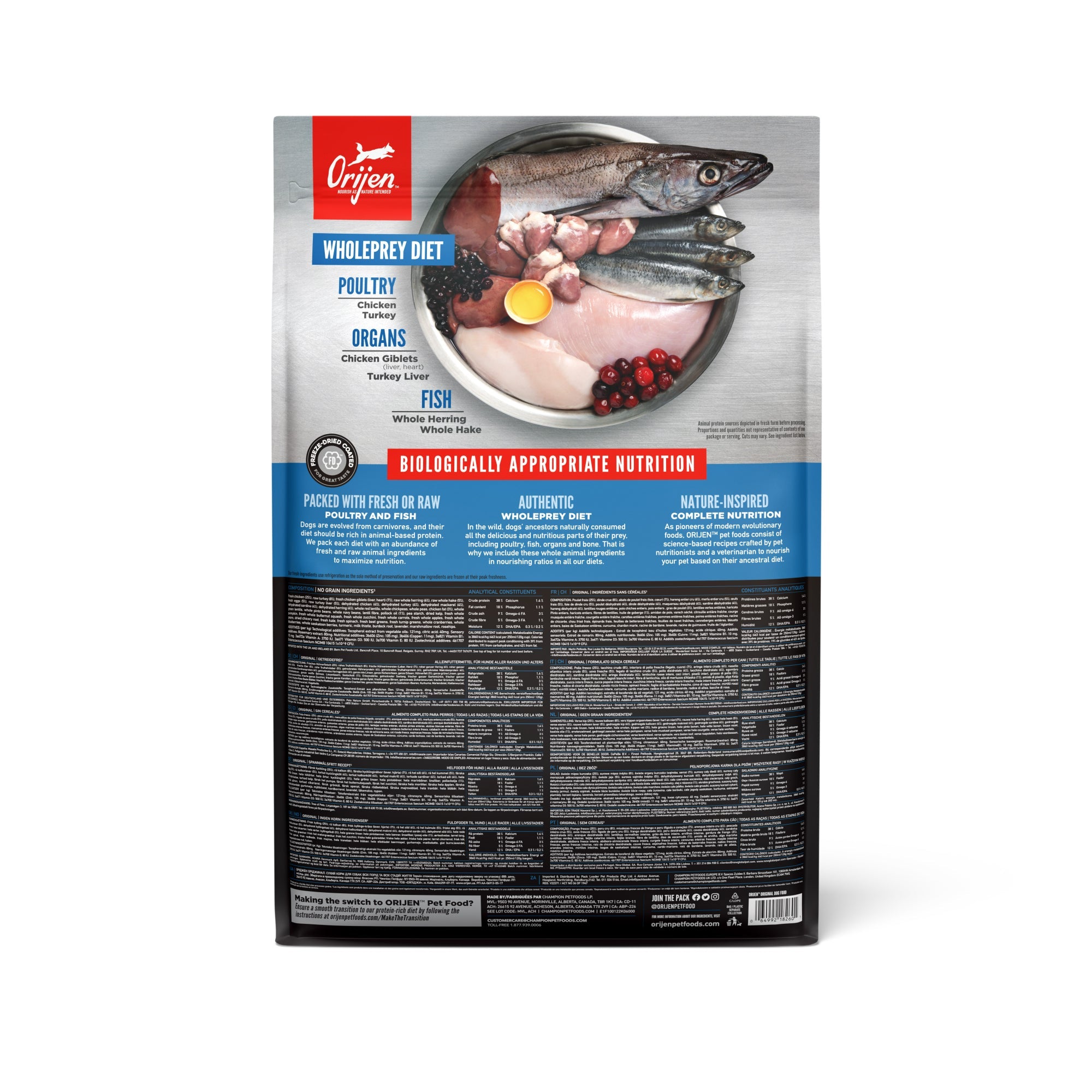 Help your dog thrive with the power of protein-rich recipes that provide peak nourishment. Dogs are ancestral carnivores, so they need a Biologically Appropriate diet rich and varied in whole animal ingredients. ORIJEN® Original diet is packed with 85% quality animal ingredients like fresh or raw free-run chicken and turkey, and wild-caught or sustainably farmed fish. Packed with WholePrey animal ingredients like organs and bone, ORIJEN food is made with the most nutrient-dense, succulent parts of the prey to deliver the nutrition dogs need. The result is a diet for your canine companion that is beyond comparison.
